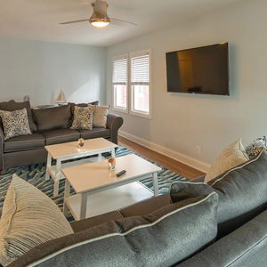 Modern and well-lit, this spacious unit sleeps up to 10, and is fully equipped with a stocked kitchen complete with quartz countertops and stainless appliances. With an open living/dining space, it's perfect for preparing large meals and enjoying time with your entire group. Step outside onto the front covered furnished patio to enjoy a beverage with the beach air, and have a front row seat for the Friday night fireworks!